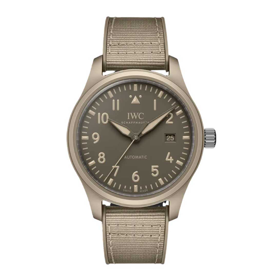 The Pilot’s Watch Automatic 41 TOP GUN Mojave Desert sports a sand-colored ceramic case and a subdued brown dial.