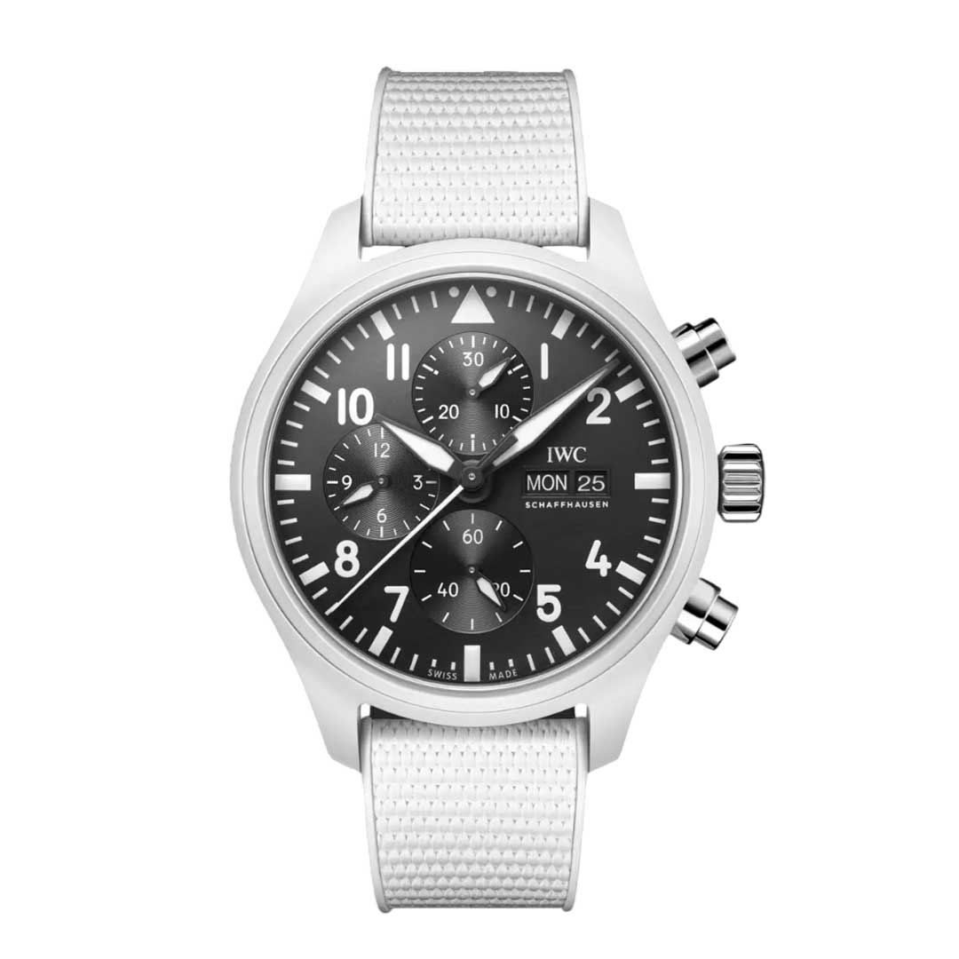 The white ceramic case of the Pilot's Watch Chronograph TOP GUN Edition “Lake Tahoe” is inspired by white US Navy uniforms and the fascinating winter landscape around Lake Tahoe.