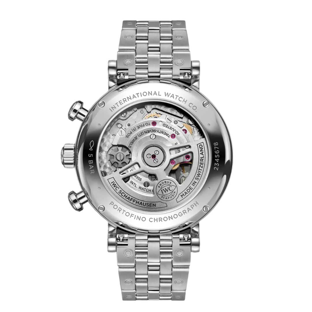 The Portofino Chronograph 39 is equipped with the IWC manufacture caliber 69355 and a sapphire crystal case back.