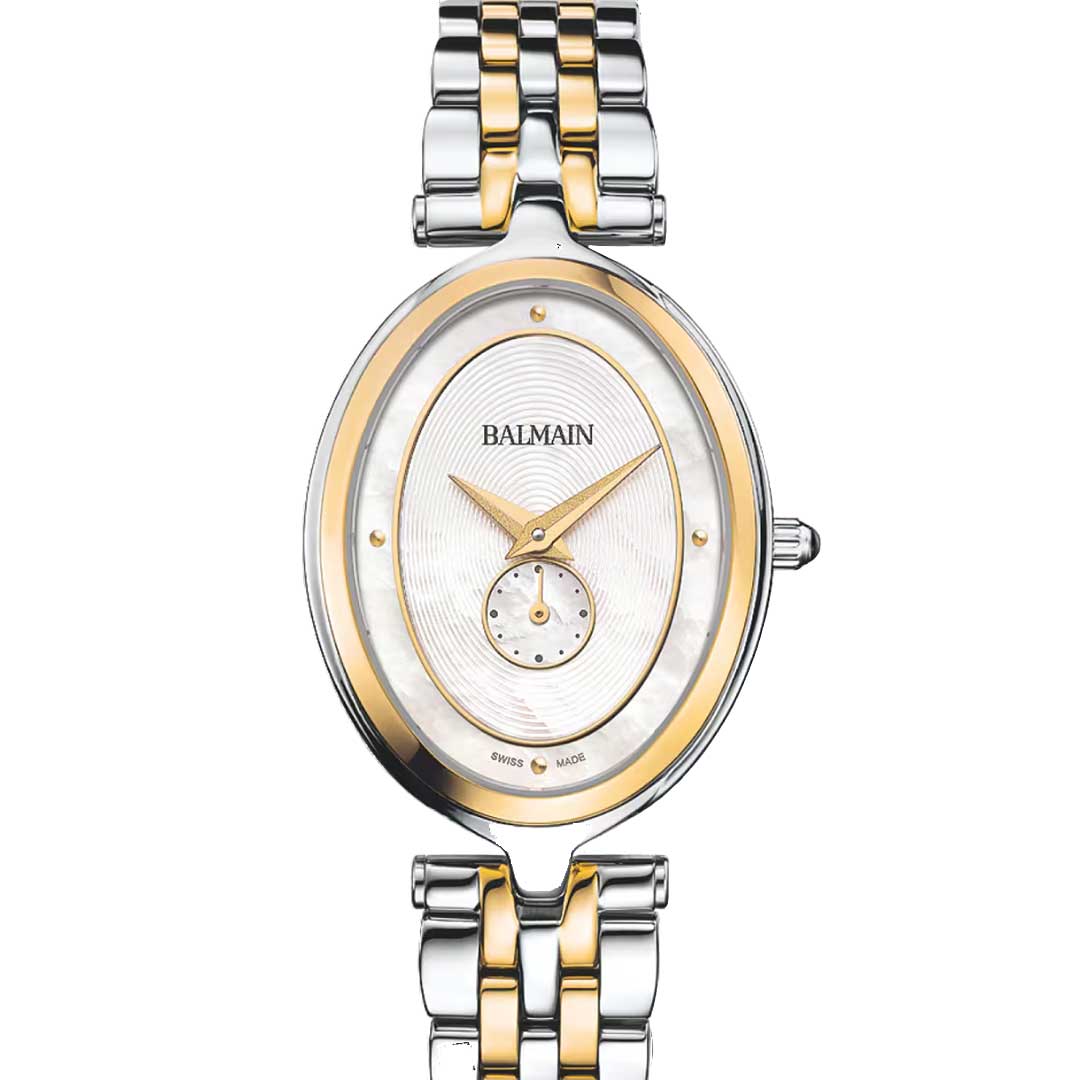 The Balmain Haute Elegance Oval is an artistic women’s watch with a modern design inspired by Parisian Haute Couture. Its oval shape, minimalist dial with a small counter and clean design adds a confident touch, while the 26 x 31.70 mm bicolor stainless steel and yellow gold PVD case, with a refined 6.45 mm profile and matching bracelet, offers timeless style. This Swiss Made timepiece features a sapphire crystal glass.