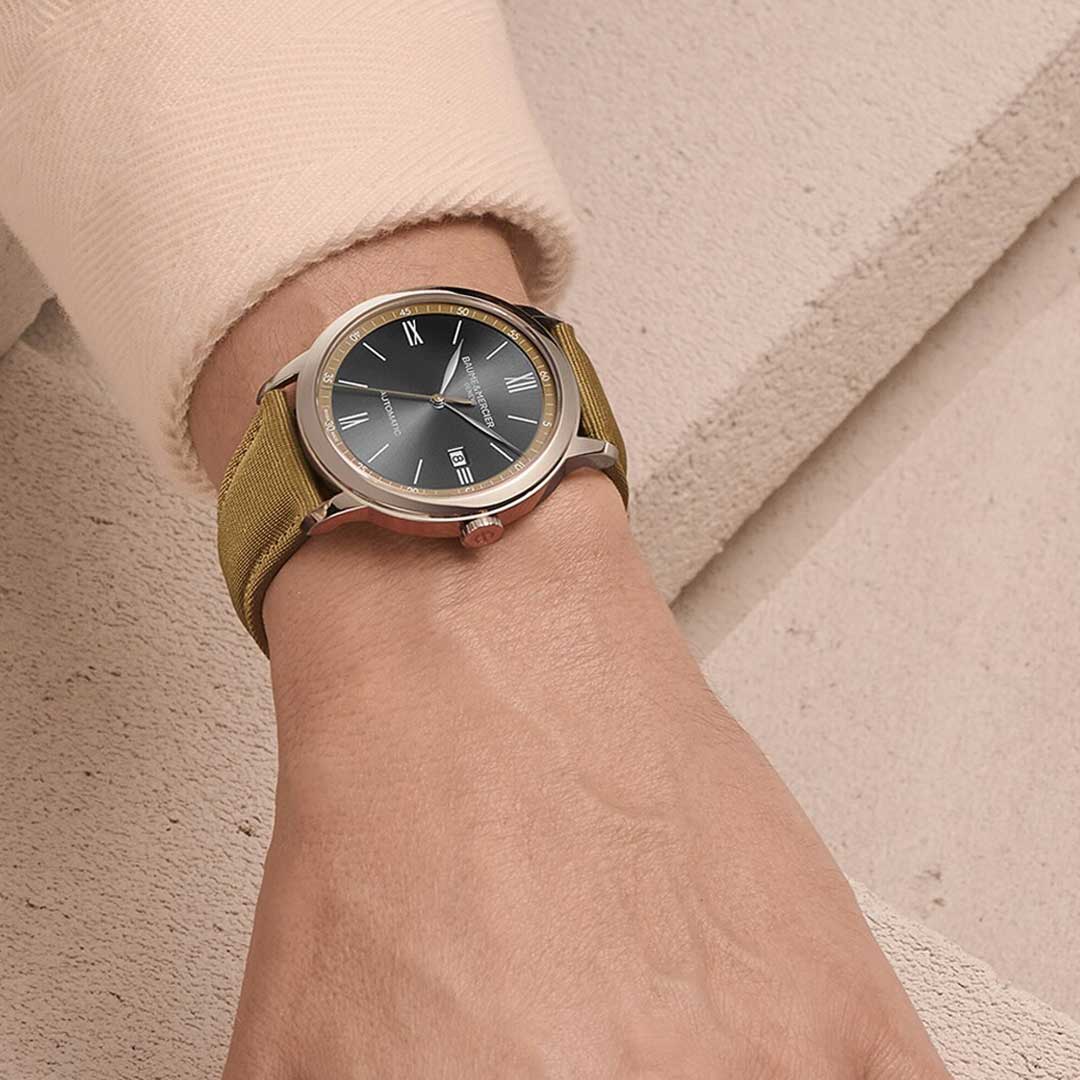 In 2022, Baume & Mercier revisits the street style codes in a play of materials and timeless shades. Khaki is in the spotlight, with a versatile palette ranging from sand beige to olive green, offering a natural effect that adapts to every style.