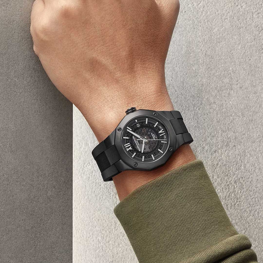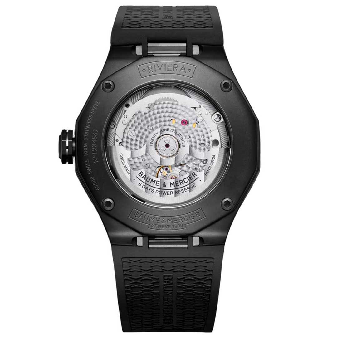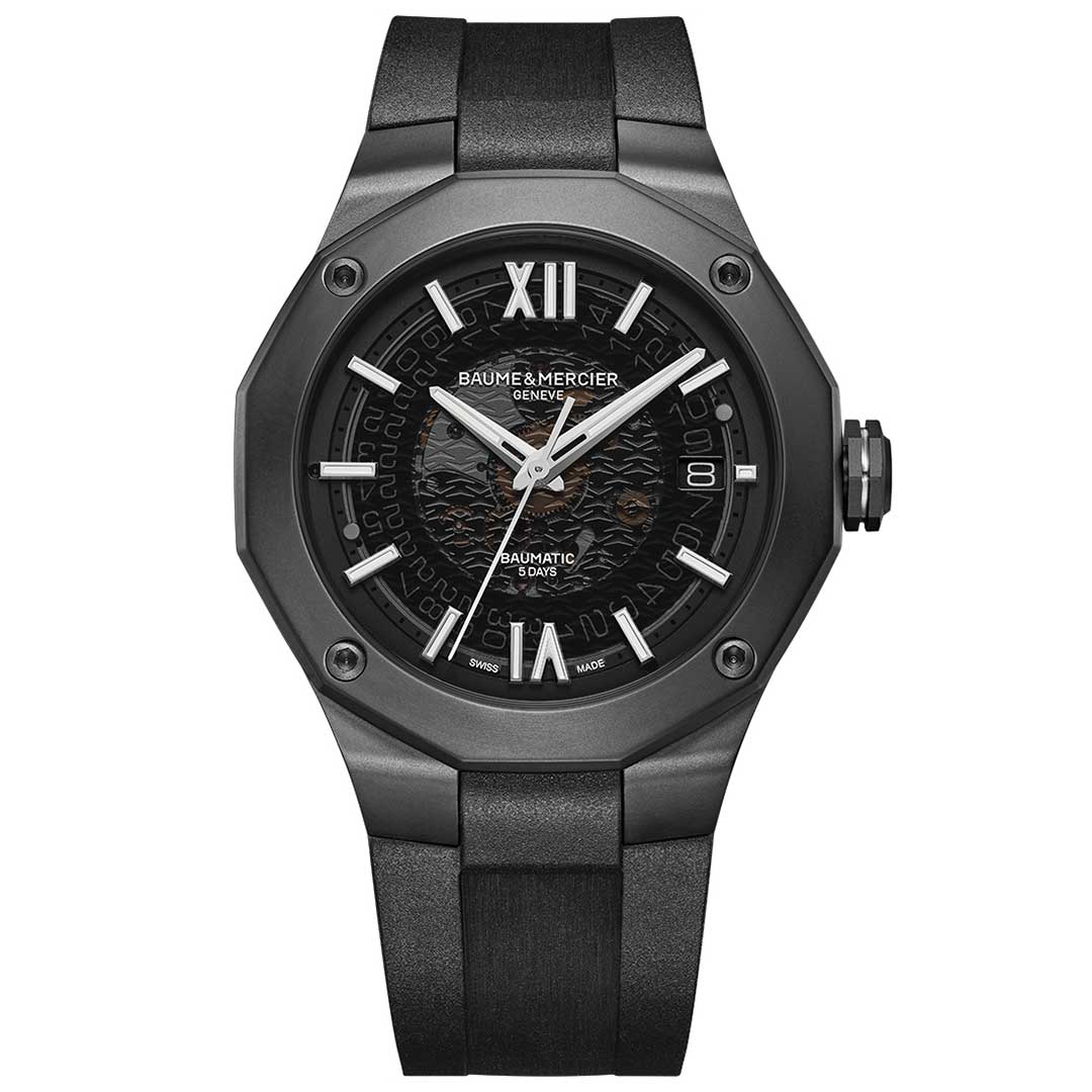 Driven by the prestigious Baumatic manufacture calibre, the Riviera 10617 is the subtle combination of refined and sporty look. Displaying a smoked sapphire gray dial and a black steel-ADLC dodecagonal case, this distinctive silhouette is finished with a black rubber strap for an ultimate black look.