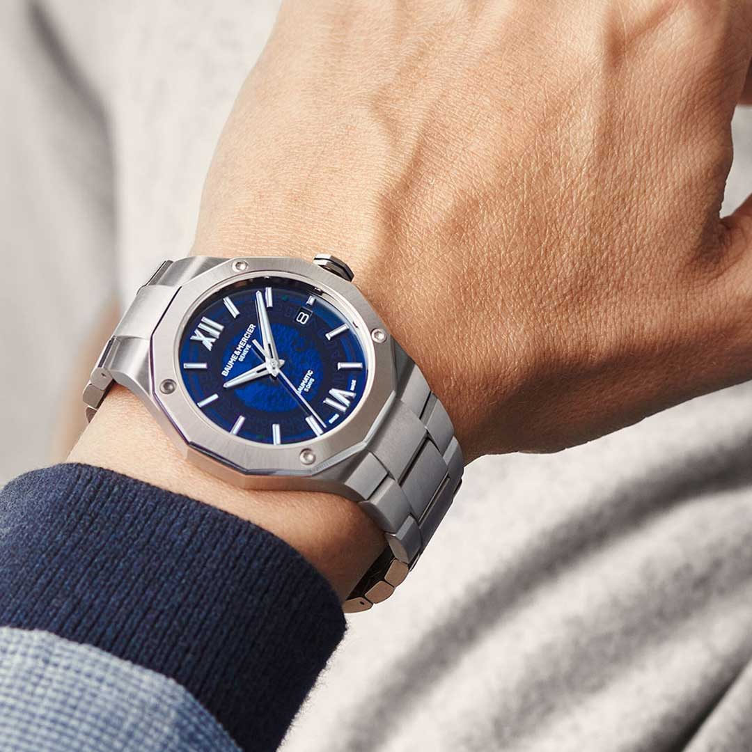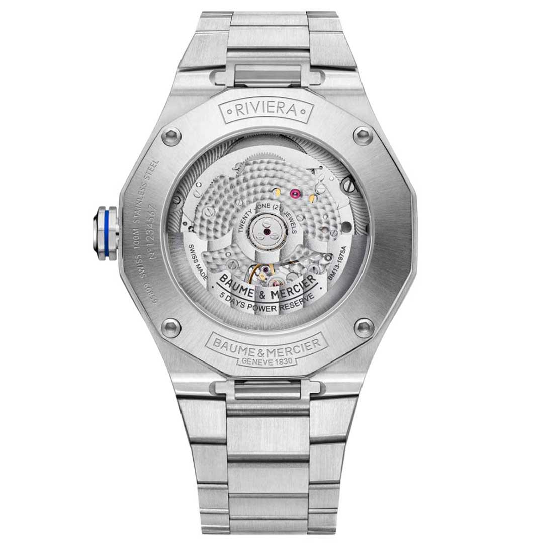 Driven by the prestigious Baumatic manufacture calibre, the Riviera 10616 is the all-road Swiss watch by excellence. Its transparent blue sapphire dial, its interchangeable metal bracelet and open caseback complete the sporty look of this "Swiss-Made" timepiece.