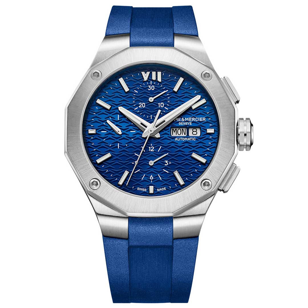 Equipped with Valjoux automatic movement, this Riviera is adorned with a blue sun satin-finished dial and a matching blue rubber strap This timepiece with assertive characters fits perfectly with Maisons' chronographs tradition.
