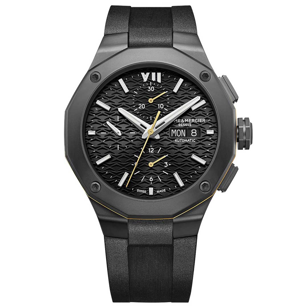 Equipped with Valjoux automatic movement, this Riviera combines a black case in microblasted ADLC-steel, a black sun satin-finished dial and a black rubber strap for a total black look. This timepiece with assertive characters fits perfectly with Maisons' chronographs tradition.