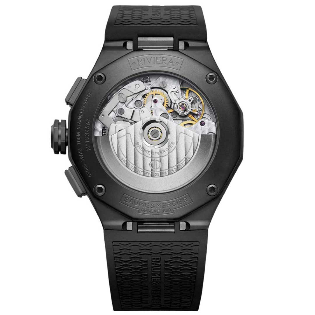 Robust and reliable, Riviera chronographs carry a tried and tested “Swiss made” automatic movement (Valjoux 7750) with a 48-hour power reserve and runs at 28,800 vph, or 4 Hertz.