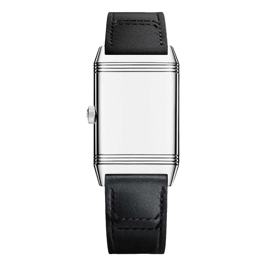 The Reverso Classic Monoface Small Seconds offers discreet elegance for everyday wear. The dial has a double finish – guilloché in the centre and vertically brushed on the outside. The play of light reveals a geometric, textured pattern reminiscent of stacked coins, against which the minute track, hour numerals, blued baton hands and small seconds at 6 o’clock stand out. The reverse of the case can be personalised by engraving. The manually wound mechanical movement Calibre 822 draws on a 42-hour power reserve. The black calfskin strap, designed by Casa Fagliano, features a pin buckle.