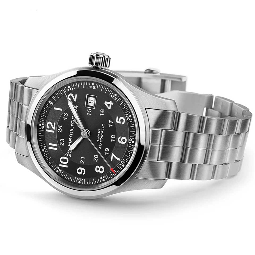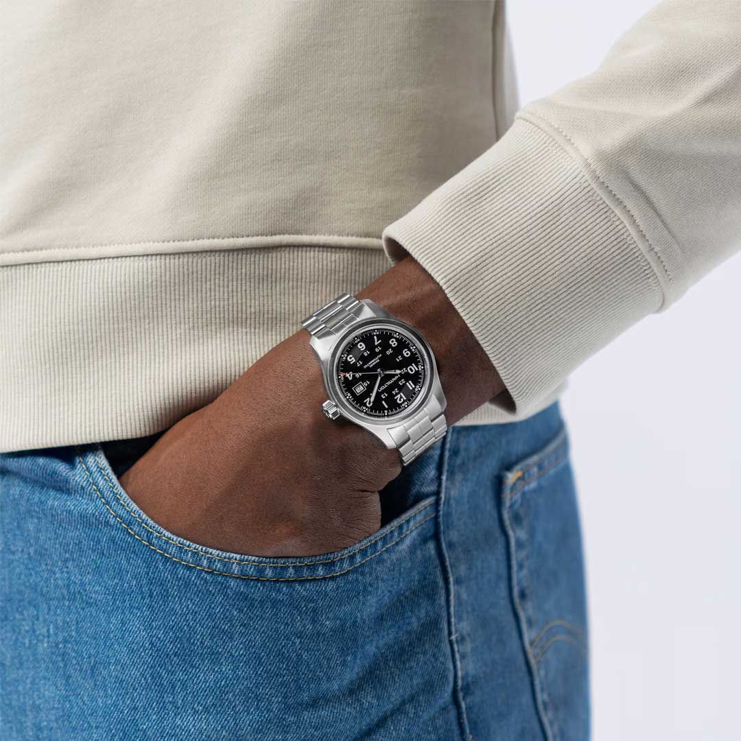 Climbing mountains, trekking through the forest or negotiating the urban jungle: The Khaki Field Auto is equal to your needs out in the field. With the exclusive H-10 automatic caliber offering up to 80 hours of power reserve, it won't let you down.