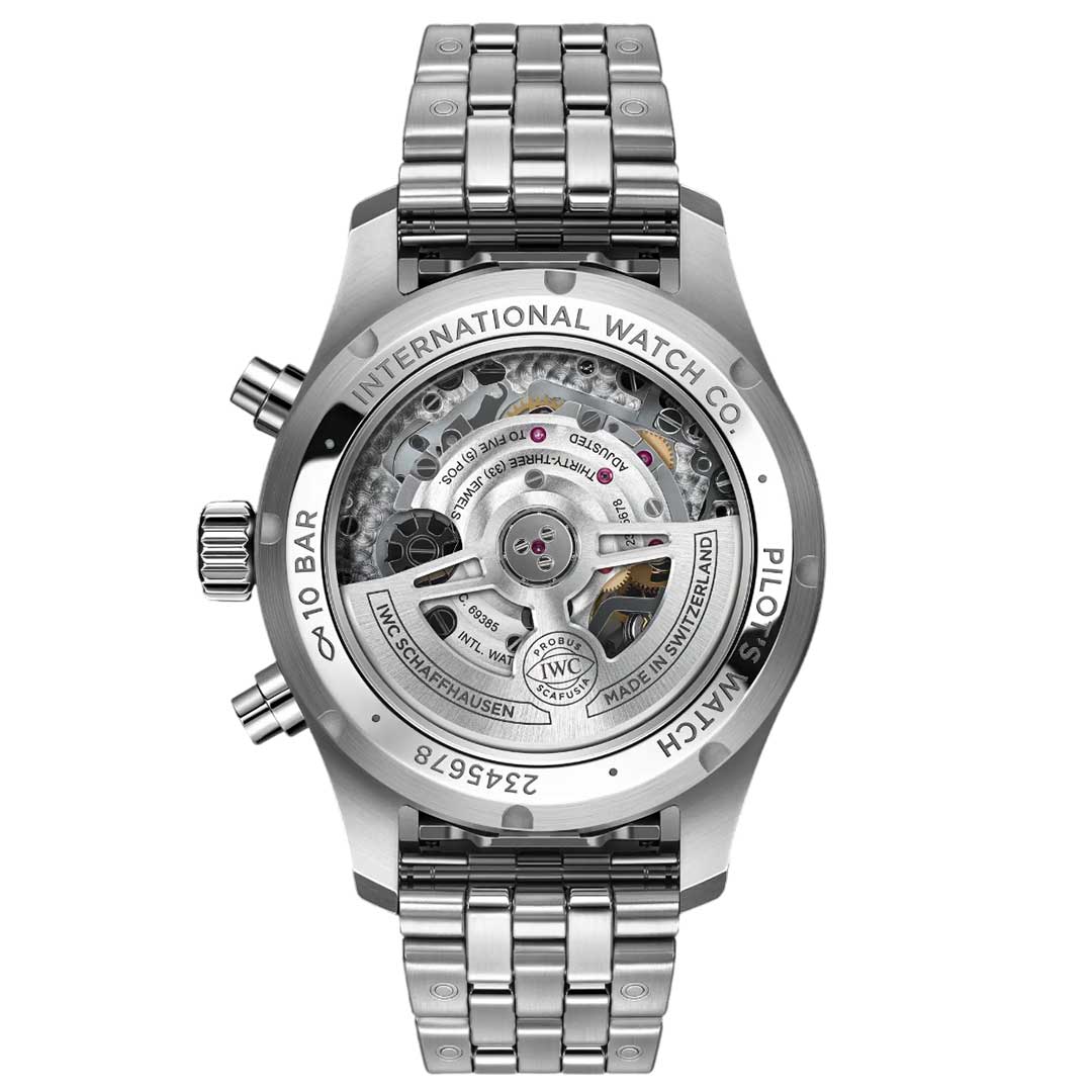 The Pilot’s Watch Chronograph 41 in an ergonomic 41-millimetre case size is powered by the IWC-manufactured 69385 calibre. The robust and precise chronograph movement with a column wheel can be observed through the sapphire glass back.