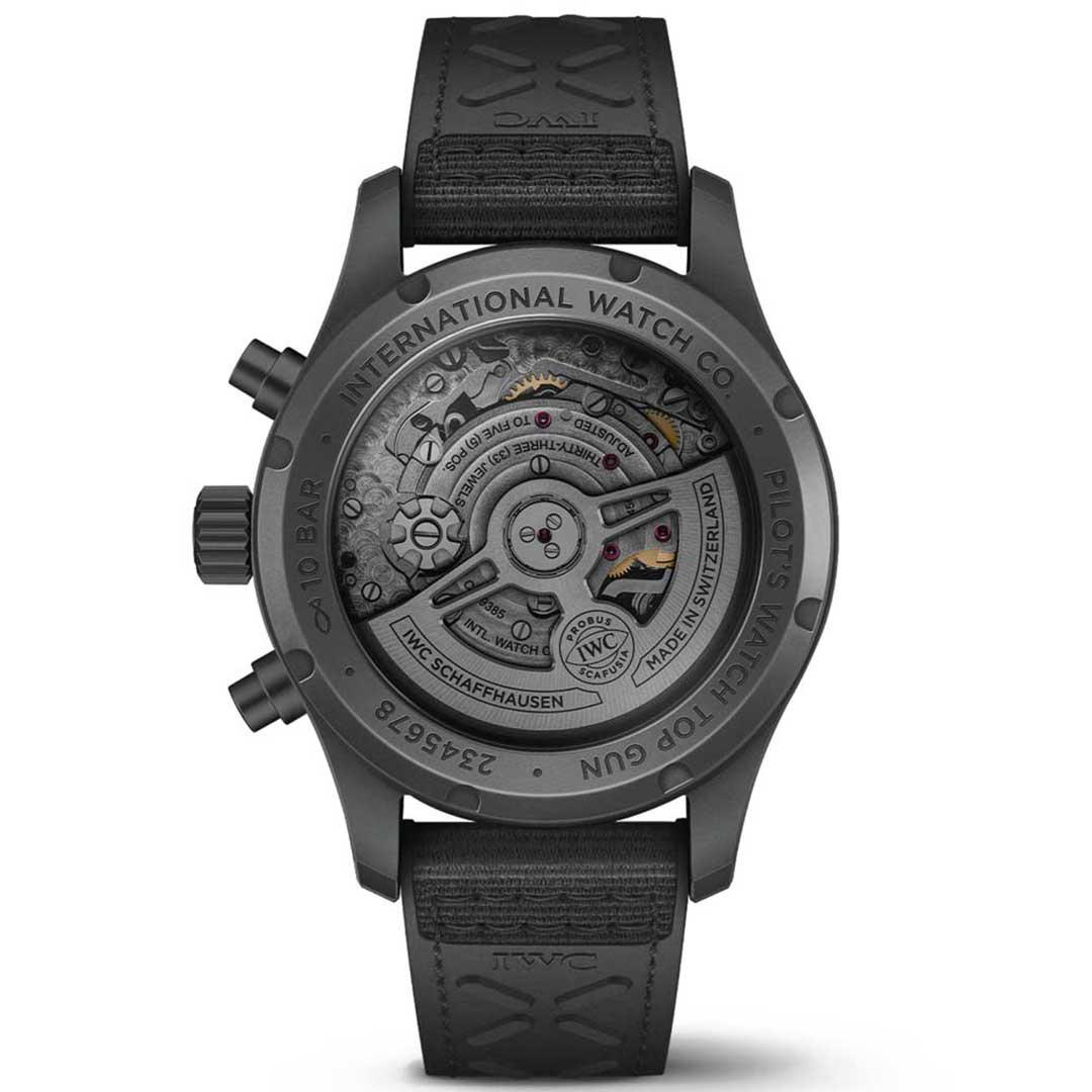The Pilot’s Watch Chronograph 41 TOP GUN Ceratanium® combines a case, crown and pushers made of Ceratanium® with black hands, as well as printing and luminescent material in a subdued white. The all-black design is completed with a tinted sapphire glass case back.