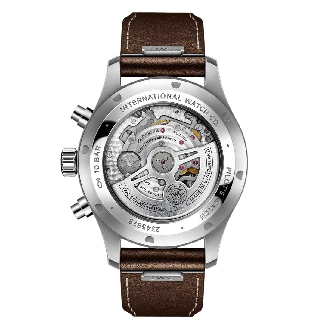Chronographs have formed an integral part of IWC Schaffhausen’s Pilot’s Watches collection since 1994. This Pilot’s Watch Chronograph features a stainless steel case with a diameter of 43 millimeters, a green dial, and rhodium-plated hands. The high-contrast dial with large Arabic numerals and the triangle index marker at 12 o’clock has been designed in the style of an easy-to-read cockpit instrument. Thanks to luminescent elements, the time can be read at a glance, even at night, or in difficult visibility conditions. The IWC-manufactured 69385 caliber, a precise and robust chronograph movement in classic column-wheel design, enables measurement of stop or aggregate times of up to 12 hours. The hours are displayed on the counter at 9 o’clock, the minutes at 12 o’clock. The small second features a red hand and is located at 6 o’clock. The self-winding movement with a power reserve of 46 hours is visible through the sapphire glass back. Water-resistant to 10 bar, the chronograph is fitted on a brown calfskin strap with a pin buckle. Thanks to the integrated EasX-CHANGE® system, the strap can be easily changed without additional tools.