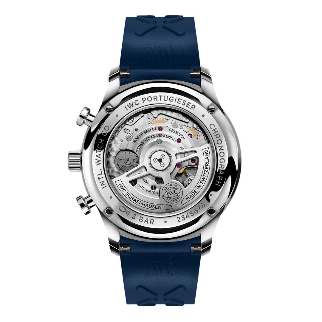 Iconic Portugieser design, combined with practical and easy-to-use chronograph function: With its winning combination of elegance and sportiness, the Portugieser Chronograph has become one of the biggest icons from IWC Schaffhausen. This version is a fresh and contemporary take on the established design, featuring a 41-millimetre stainless steel case, a white dial with contrasting blue subdials, blue Arabic numerals, and blued feuille hands. The chronograph minutes counter is placed at 12 o’clock, while the small seconds can be found at 6 o’clock. The sapphire glass case back provides a view of the IWC-manufactured 69355 calibre. The chronograph movement in classic column wheel design enables the measurement of stop times of up to 30 minutes. Furthermore, this elegant sports watch is fitted with a flexible and durable blue rubber strap with pin buckle, ensuring a perfect fit on the wrist and offering excellent wearing comfort.