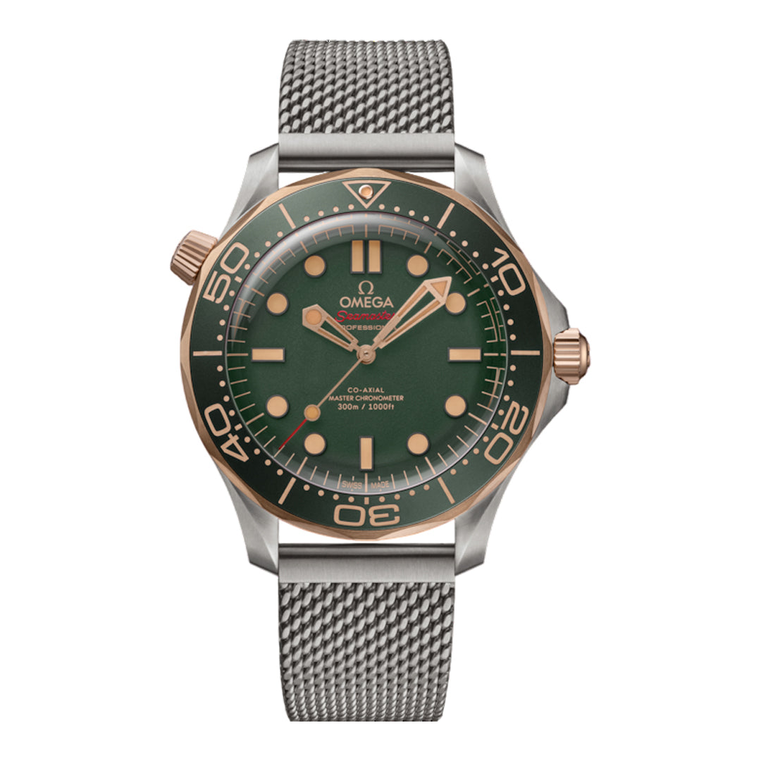 This 42 mm model is crafted in grade 2 titanium and OMEGA’s exclusive 9K Bronze Gold. It includes a green oxalic anodized aluminium bezel ring with a diving scale in vintage Super-LumiNova.