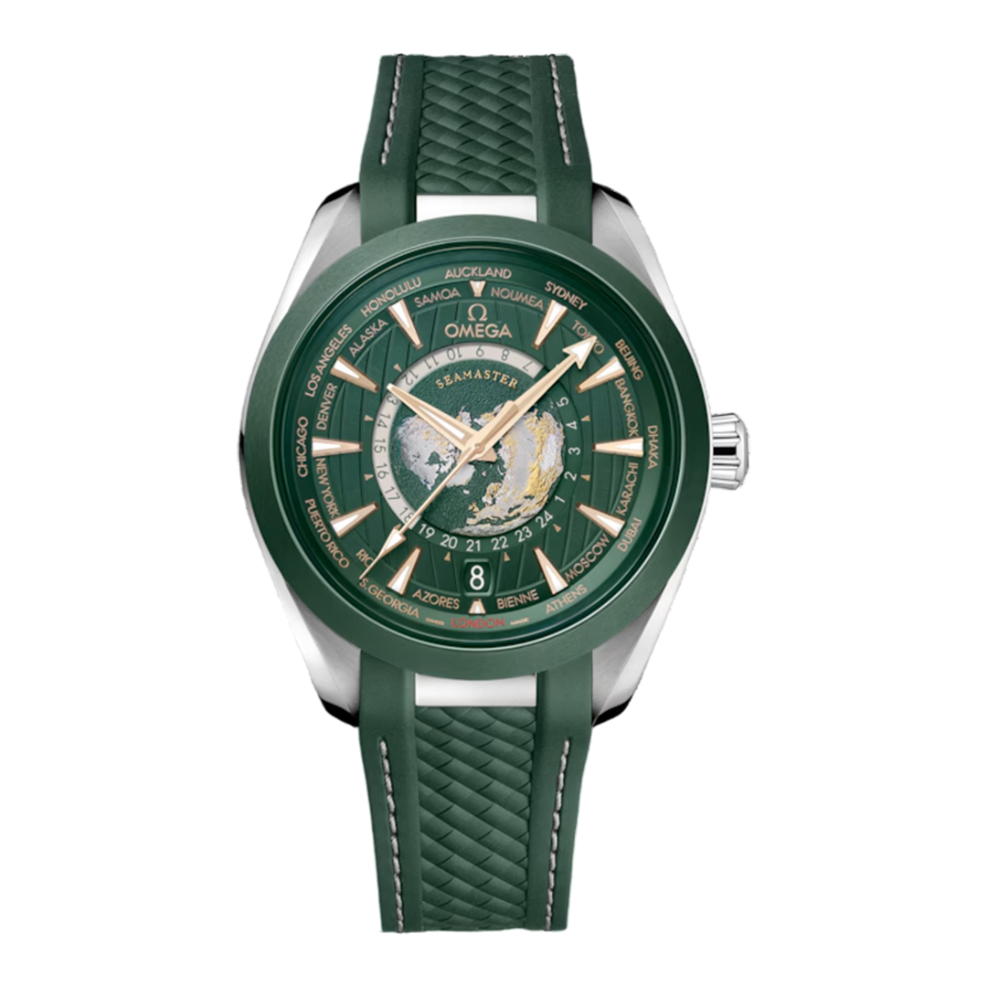 At the centre of the sun-brushed green dial, framed by a polished-brushed green ceramic bezel, OMEGA has produced a vision of Earth, viewed from above the North Pole, by laser-ablating continents and colours on a grade 5 titanium surface. Circling the topographic map is a 24-hour indication, divided into night and day sections.