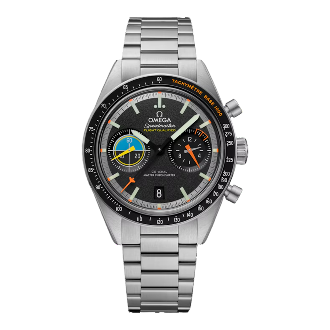 This Speedmaster Pilot has a brushed flat-links steel bracelet with OMEGA’s patented screw and pin system. Providing the power is OMEGA’s Co-Axial Master Chronometer Calibre 9900. The watch is presented in a special travel pouch with strap-changing tool and NATO strap made with KEVLAR® threads.