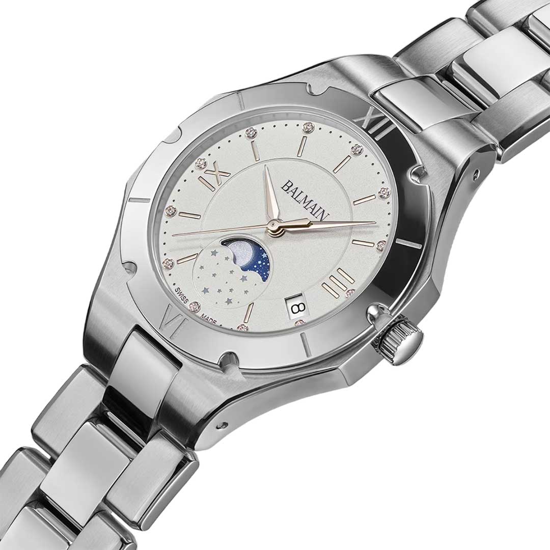 The Be Balmain is a refined women’s watch that combines bold style with a modern design inspired by Parisian Haute Couture. Its white dial set with 12 Top Wesselton VS-SI diamonds, moonphase display and classical roman indexes add a confident touch. The 33 mm stainless steel case with an uncompromising 8.15 mm profile and stainless steel bracelet, offers everyday sophistication. This Swiss Made timepiece features a sapphire crystal glass.