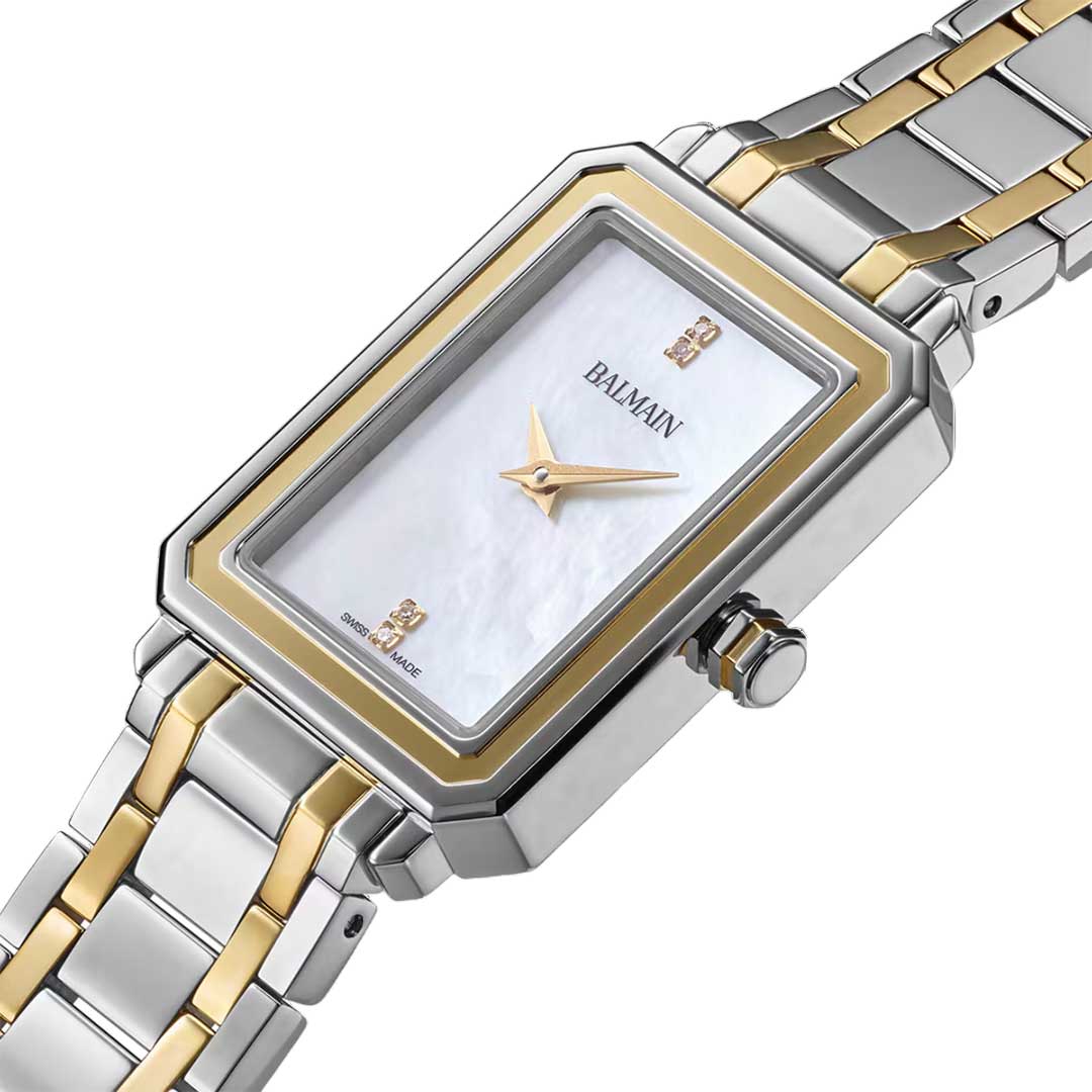 The Balmain Eirini is an elegant women’s watch that blends delicate design with the spirit of Parisian Haute Couture. Its white mother-of-pearl dial, set with 4 Top Wesselton VS-SI diamonds, totaling 0.014 carats, adds a graceful touch while the 25 x 33 mm bicolor stainless steel and yellow gold PVD case, with a slim 6.85 mm profile and matching bracelet, offers everyday refinement. This Swiss Made timepiece features a sapphire crystal glass.