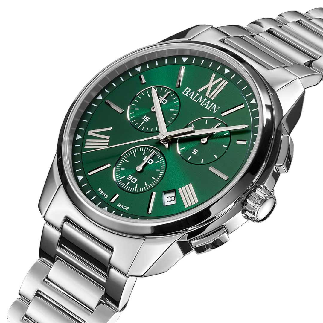 The Balmain Madrigal is a refined men’s watch that blends bold design with the artistry of Parisian Haute Couture. Its deep green dial, three subdials and modern roman indexes add a confident touch, while the 42 mm stainless steel case, with an uncompromising 10.36 mm profile and stainless steel bracelet, offers everyday style. This Swiss Made timepiece features a sapphire crystal glass.