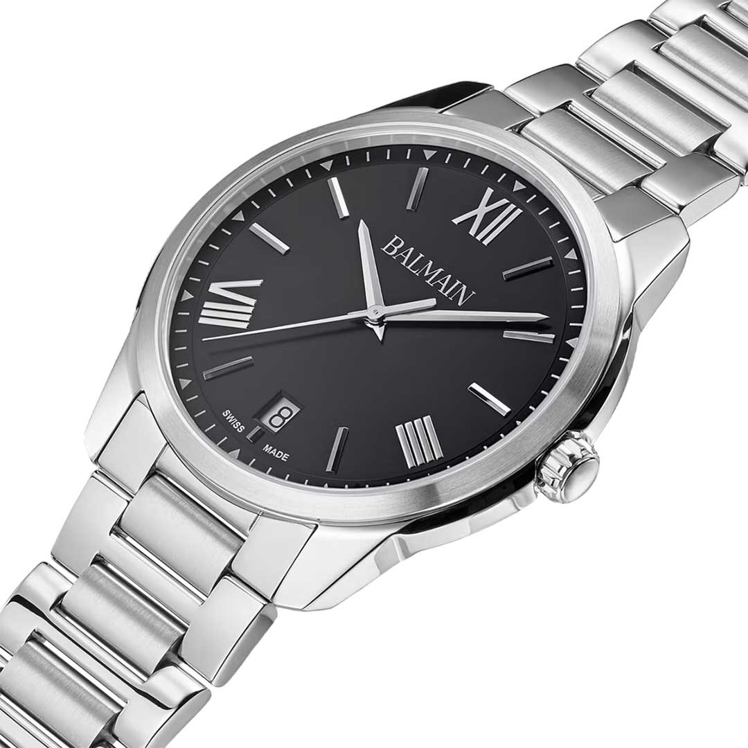 The Balmain Madrigal is a sophisticated men’s watch that blends bold elegance with a modern design inspired by Parisian Haute Couture. Its black dial with modern roman indexes adds an expressive touch. The 40 mm stainless steel case with a slim 7.43 mm profile and matching bracelet offers everyday refinement. This Swiss Made timepiece features a sapphire crystal glass.