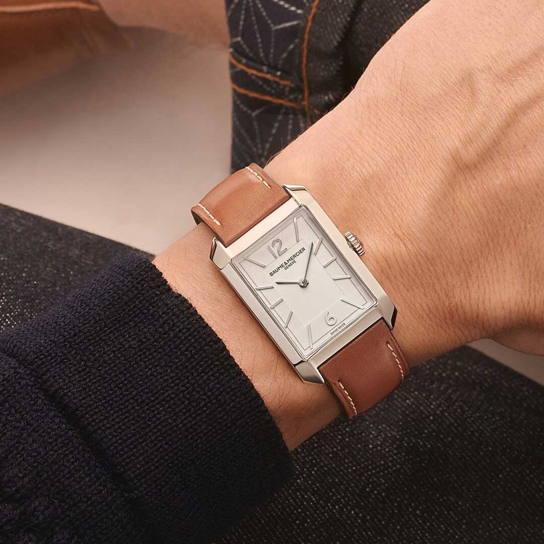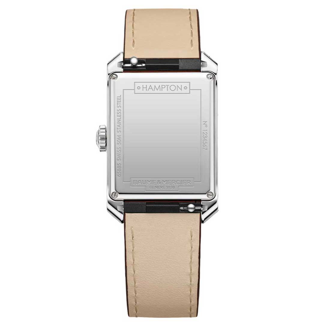 This quartz Hampton timepiece balances elegance with excellence in watchmaking. It comes with an opaline white dial and grey minute line. The sleek rectangular stainless steel case is complemented by an interchangeable light brown calfskin with beige stitching.